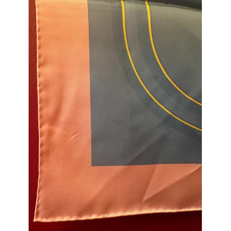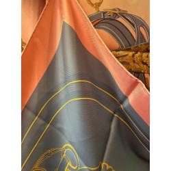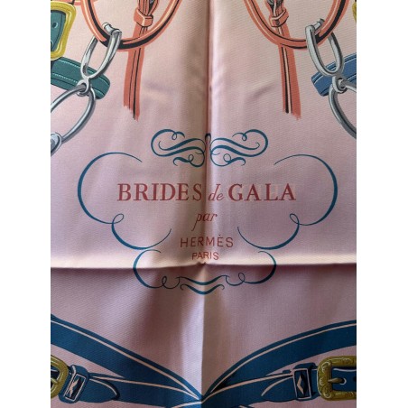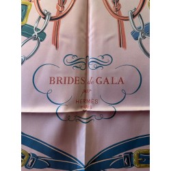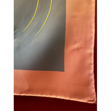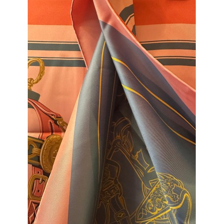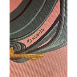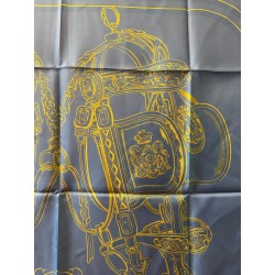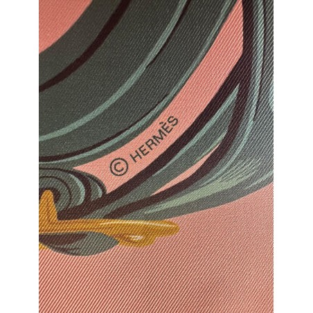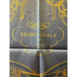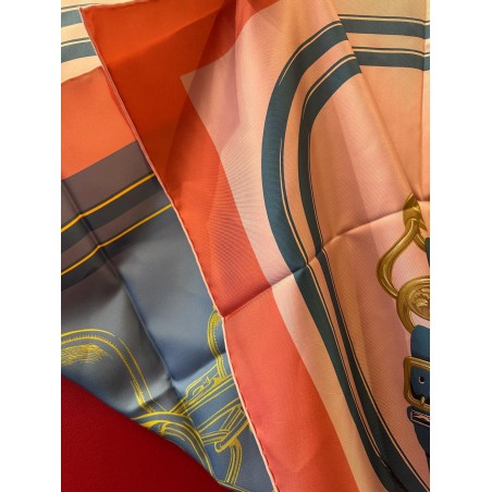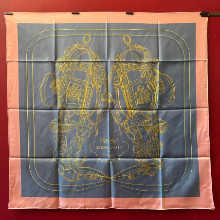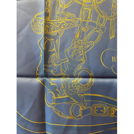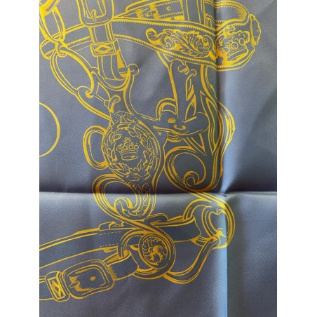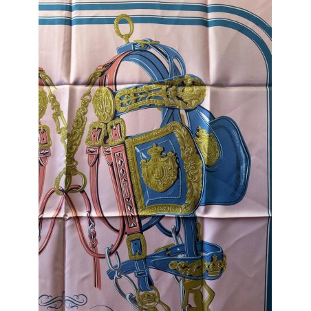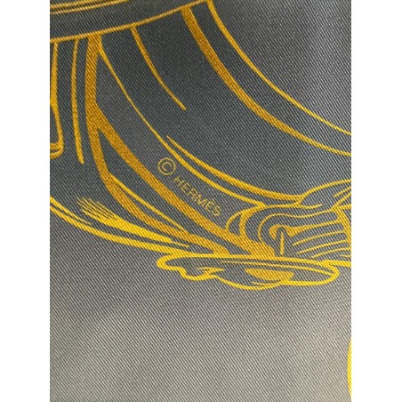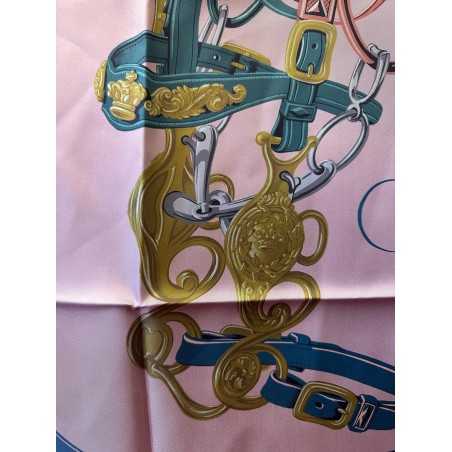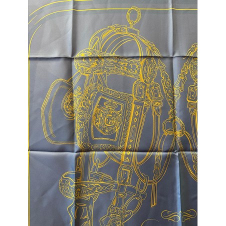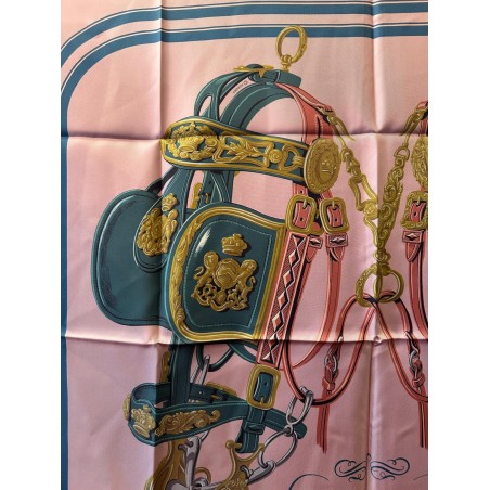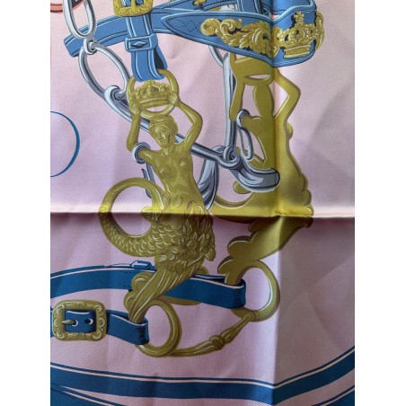Le carré par excellence, l'un des dessins les plus emblématiques de la maison Hermès. En 1957, Robert Dumas travaille avec Hugo Grygkar. Il pose sur le sol, face à face deux brides somptueuses, et l'évidence s'impose, la composition est parfaite, d'une sobriété sans égal, le carré est là. Ce carré témoigne de la destinée première de la maison - sellier, harnacheur - Un très grand classique, intemporel! Son sujet ? Équestre bien sûr. A droite, deux sirènes jaillissent d'une corne d'abondance, et brandissent la couronne impériale. Cette pièce conservée dans la collection Émile Hermès, fait partie des harnais réalisé pour l'Empereur du Mexique, Maximilien d'Autriche. A gauche, sur l'oeillère, les armoiries des comtes de Ferronnays dont la collection possède de très belles pièces de harnais du 18°.