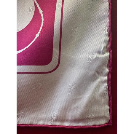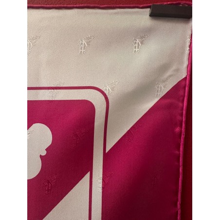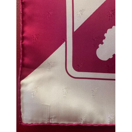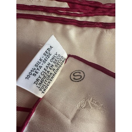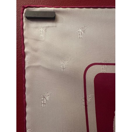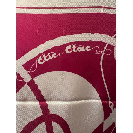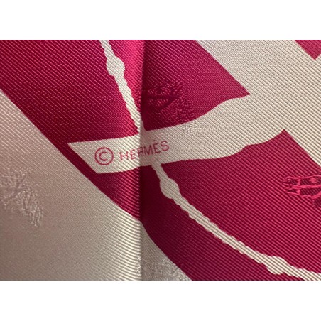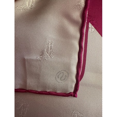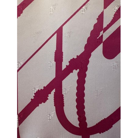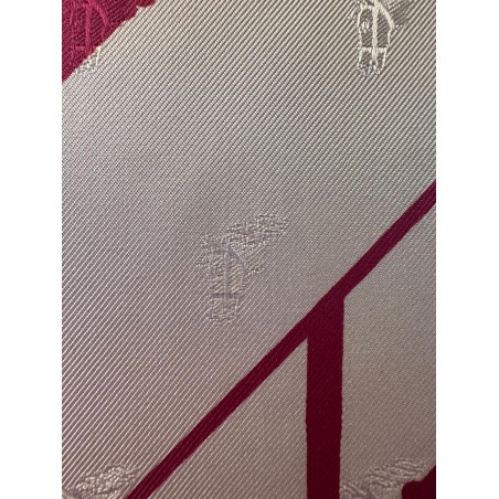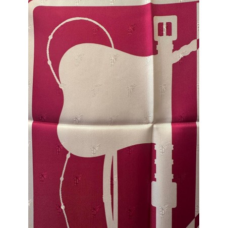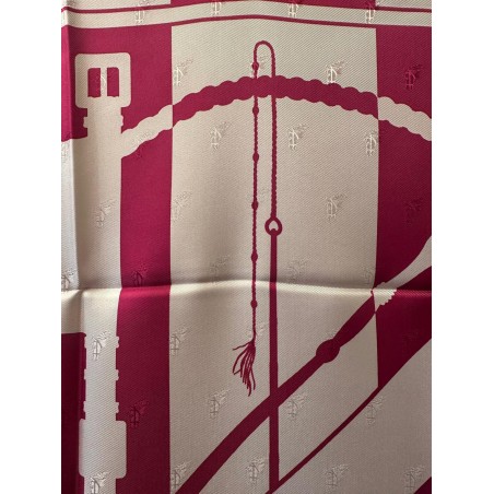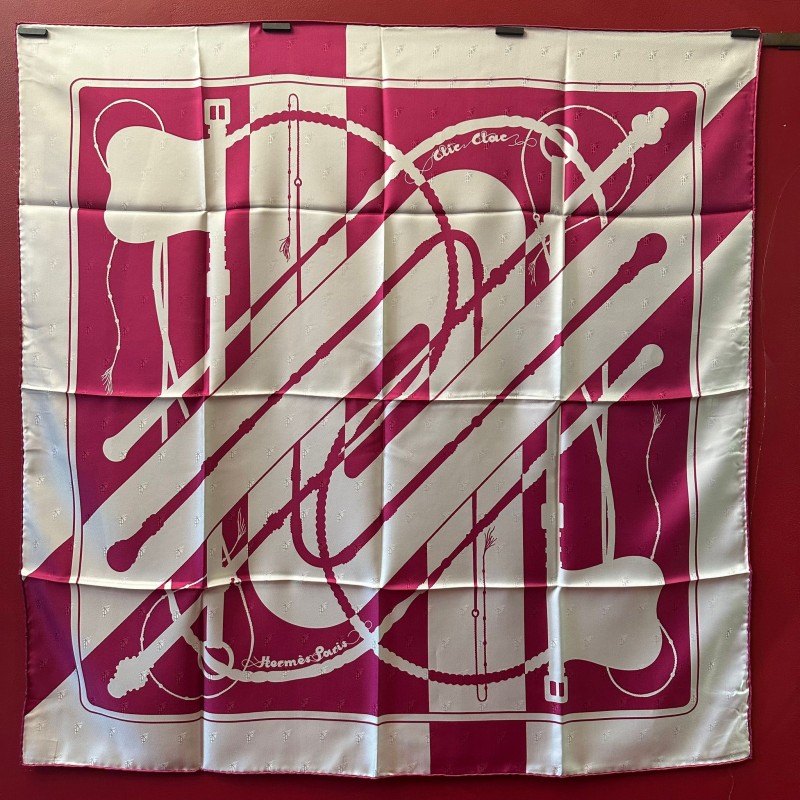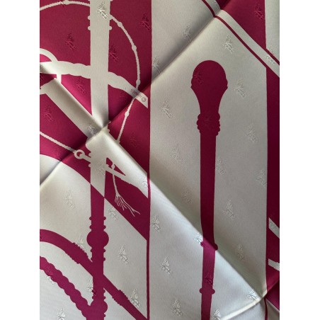 Le son des boucleries d'attelage qui s'entrechoquent au rythme des pas du cheval... Deux oeillères et six fouets composent ce carré. Ces fouets, gainés de cuir, ont des manches en bois d'épine, ce qui caractérise les plus beaux fouets anglais. Leurs bagues et leurs pommeaux sont ornés d'argent ciselé. Cette composition aux lignes nettes, sobres et dynamiques, fut dessiné par Julia Abadie dans les années 1970.