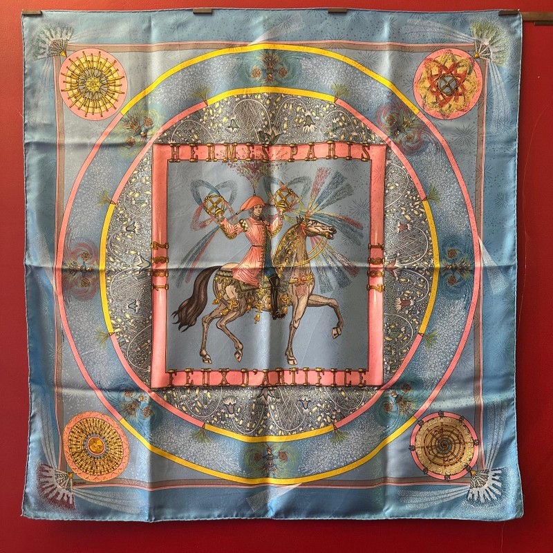 Fondée à Paris en 1837 par Thierry Hermès, la maison Hermès était à l'origine une manufacture de harnais et de selles. Hermès est une entreprise familiale qui appartient encore de nos jours aux héritiers du fondateur. Le cavalier présent au centre du carré correspond à la statue équestre que l'on peut apercevoir en levant les yeux, rue du Faubourg Saint Honoré, sur le toit de la maison Hermès