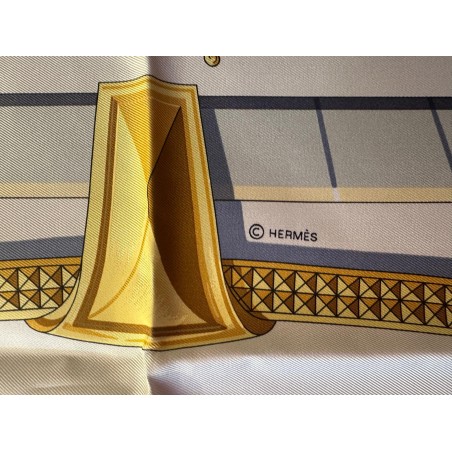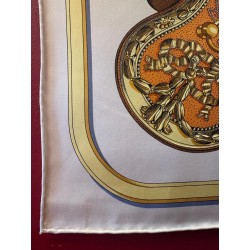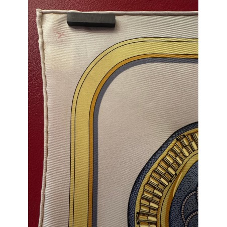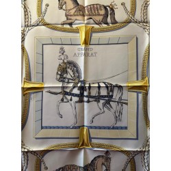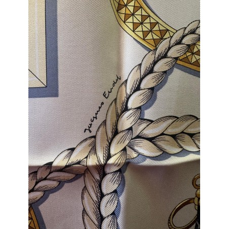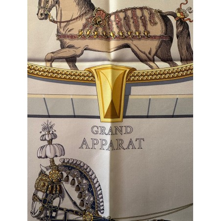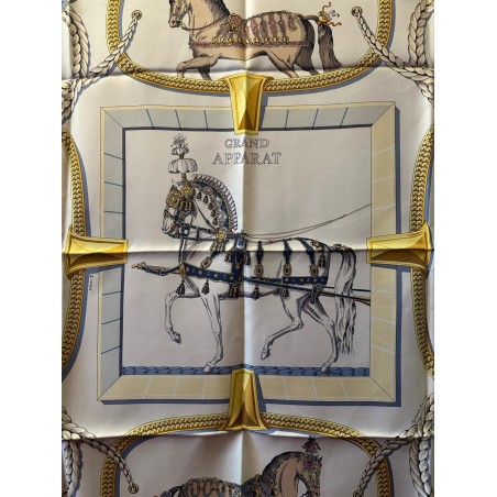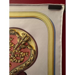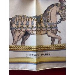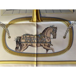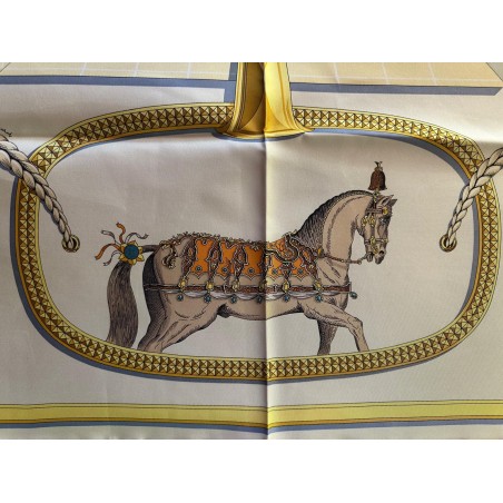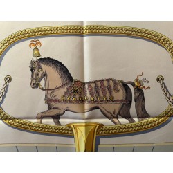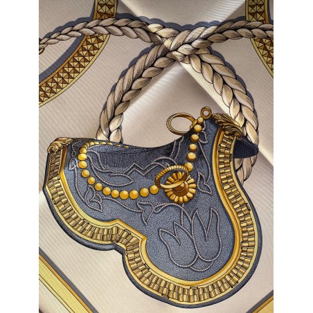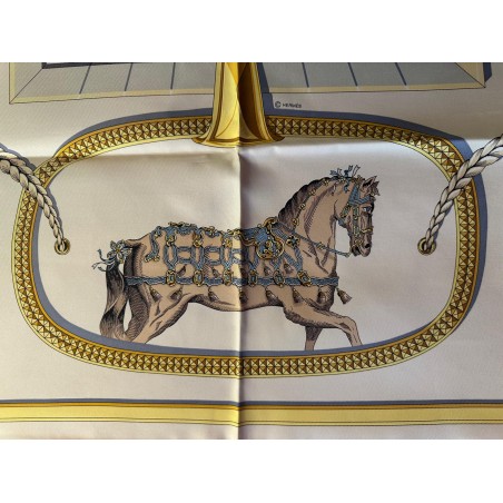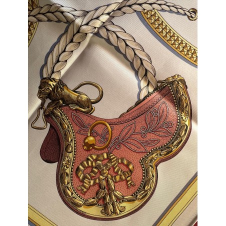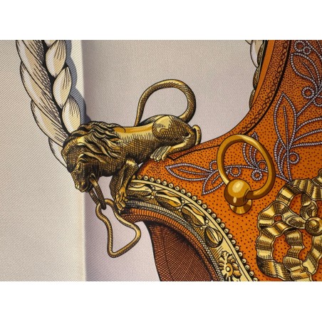 Ce carré met en scène différentes pièces de harnais de cérémonie et principalement des sellettes, ornements destinés aux parades et aux cérémonies. Le luxe de ces harnais de galas, en cuir repoussé, bordé de franges ou de galons, rehaussés d'éléments en bronze, feuilles de laurier, emblèmes royaux, armoiries, indique la noblesse du personnage transporté et l'importance de l'évènement. Retenu par des clous pyramidaux et des soutaches, le tableau du centre s'inspire du dessin d'un cheval harnaché destiné à un projet de voiture pour le sacre de Louis XVIII. Et les tresses rappellent celles des crinières, toujours impeccablement coiffées et parfois même nouées de rubans.