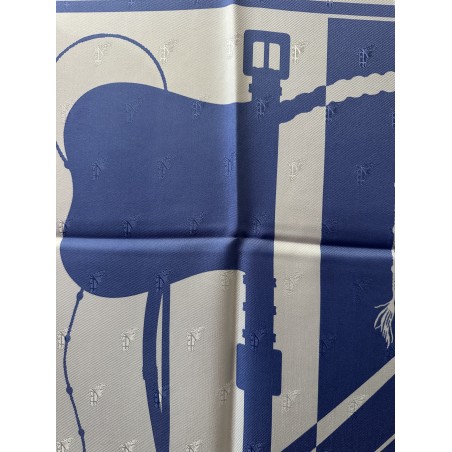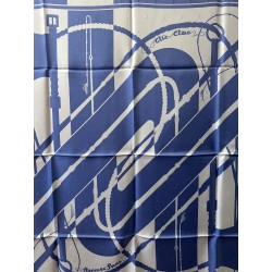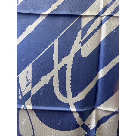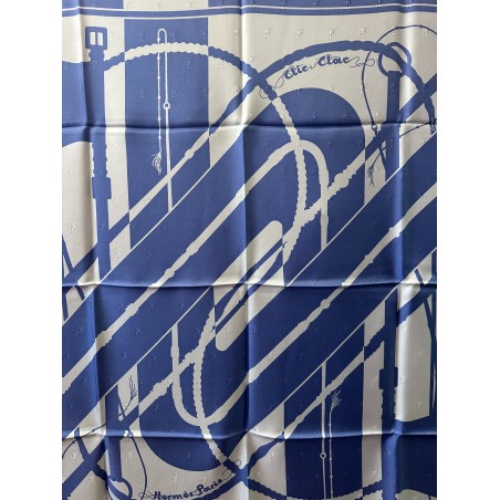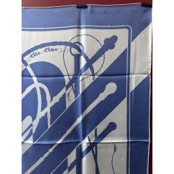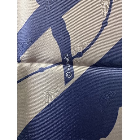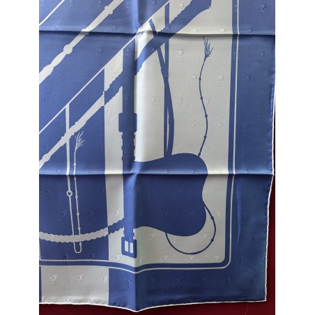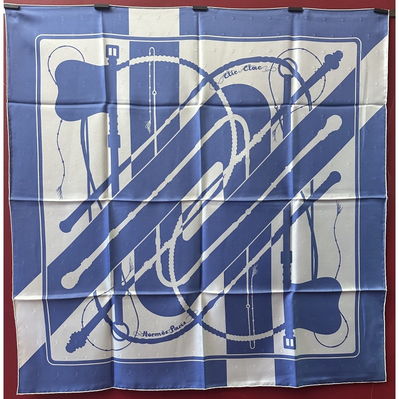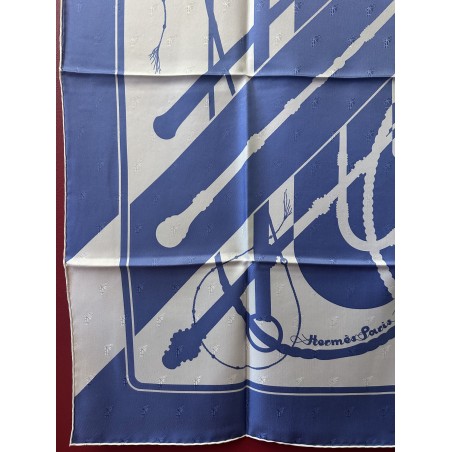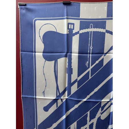 Le son des boucleries d'attelage qui s'entrechoquent au rythme des pas du cheval... Deux oeillères et six fouets composent ce carré. Ces fouets, gainés de cuir, ont des manches en bois d'épine, ce qui caractérise les plus beaux fouets anglais. Leurs bagues et leurs pommeaux sont ornés d'argent ciselé. Cette composition aux lignes nettes, sobres et dynamiques, fut dessiné par Julia Abadie dans les années 1970.