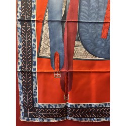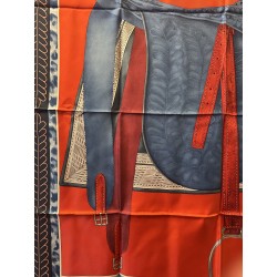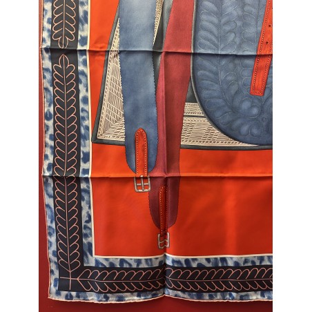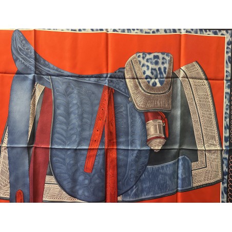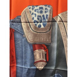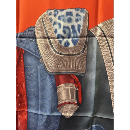 Ce carré imaginé comme un portrait par Wlodek Kaminsky, révele la beauté d'une selle de cheval. Destinée aux généraux, cette selle d'officier en "grande tenue" fut adoptée par l'armée française en 1884 et abandonnée au début de la première guerre mondiale en 1914. Elle fut réalisée par la maison parisienne Bidal et Piat, établissement réputé pour ses équipements militaires. Recouverte d'un maroquin très fin et de velours, elle est ornée d'un décor de feuillages, simple et graphique, d'une peau de panthère que l'on appelait alors "de tigre" d'une soutache et de cuivres finement ciselés. Cette selle, dite "à l'anglaise" tient une place particulière dans la collection Emile Hermès.