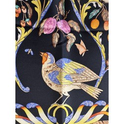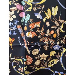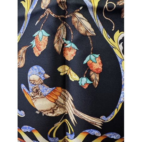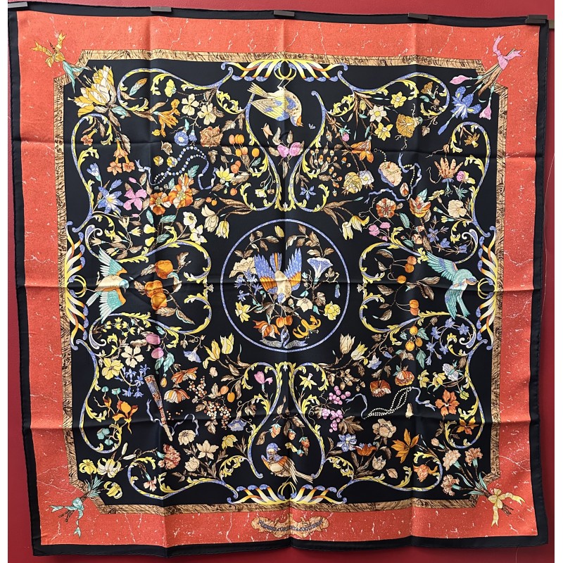 Dans l'Italie de la renaissance, les Médicis, collectionneurs et mécènes, admirent la marqueterie de pierres au point de lui dédier plusieurs ateliers. Certains artisans oeuvraient des années durant pour confectionner un plateau de table tel que celui qui inspira ce carré. L'engouement pour cet art voyagea en particulier vers l'Angleterre et vers la France. Un foisonnement de fleurs de fruits et de feuillage enserre dans ses courbes oiseaux bigarrés, papillons et insectes, colliers de perles et rubans. La finesse du trait anime plumes et pétales, les baies charnues sont une invitation... La vie, dans toute sa beauté fragile traverse cette composition minérale. La soie se substitue ici à ces pierres travaillées.