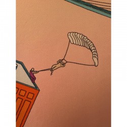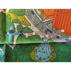 The Battery conservancy est une association fondée en 1994 partenaire des parcs et loisirs de la ville de New York. Situé à l'extrémité de Manhattan, the Battery est le parc qui longe l'Hudson en face d'Ellis Island, passage obligé des immigrants au début du siècle dernier, et de Liberty Island, dominée par la statue de la liberté. Proche de Wall Street, il demeure un lieu de mémoire et de promenade. Ugo Gattoni le décrit à sa manière, y ajoutant sa propre vision de la ville. Il en trace les contours, les gratte-ciel, la végétation et la longue esplanade au bord de l'eau, sans omettre quelques détails imprévus : une sculpture de pied surmontant une tour, une main imposante émergeant de l'Hudson et une foule de petits personnages qui s'affairent ça et là.