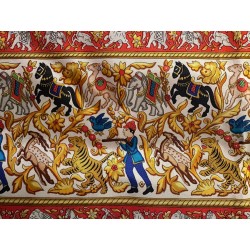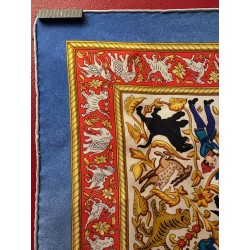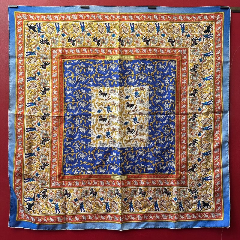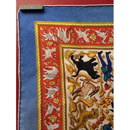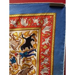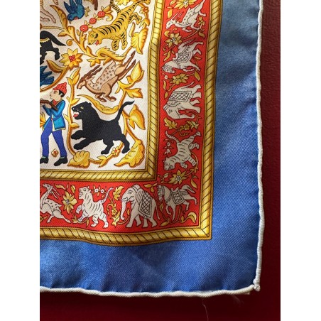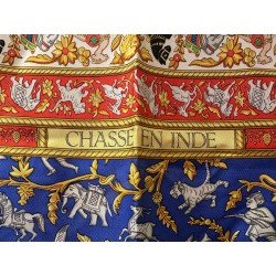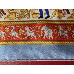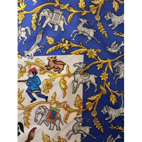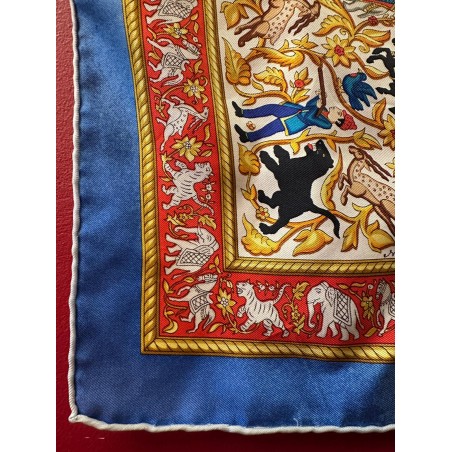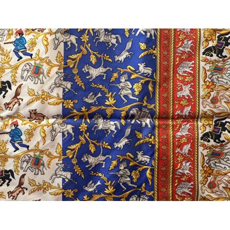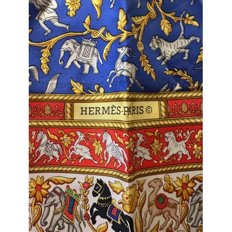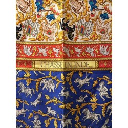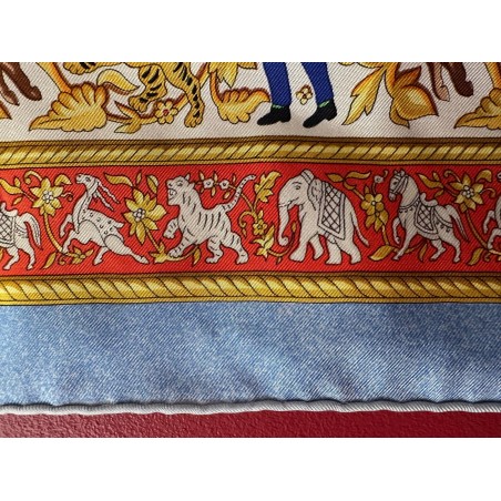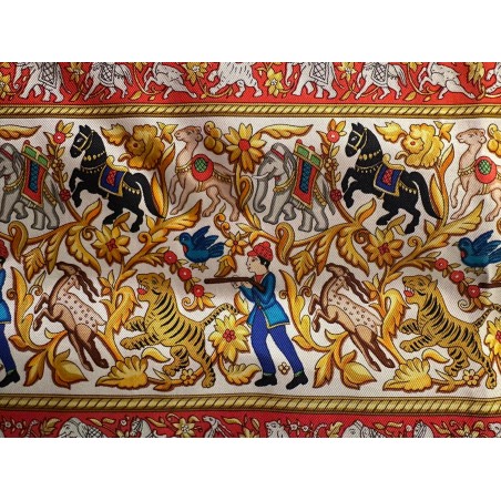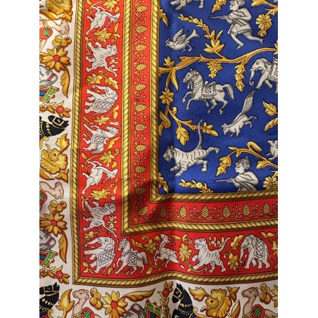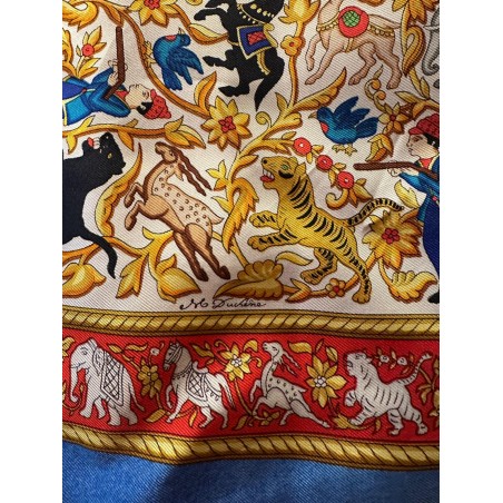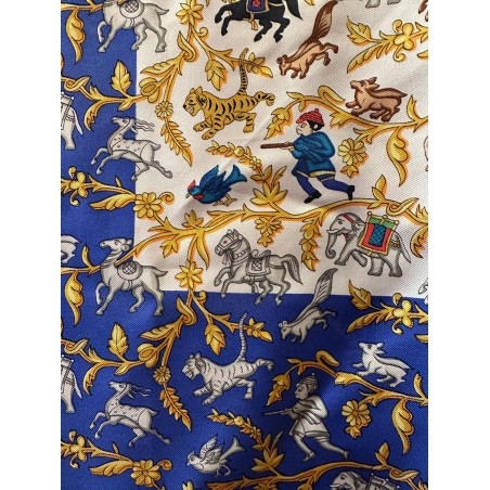 Carré créé pour l'année de l'Inde et inspiré d'une tenture de lit en soie brodée de fils d'or venant de Bénares et se trouvant aujourd'hui dans la salle à manger de l'ambassadeur de France en Inde. Cette tenture représente des scènes de chasse. Les chasseurs à dos d'élèphants, à cheval ou à pied poursuivent tigres, gazelles, oiseaux…