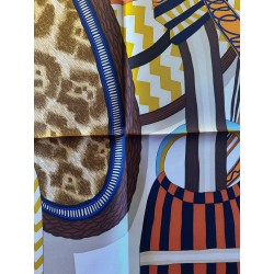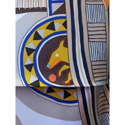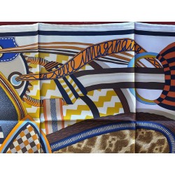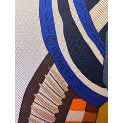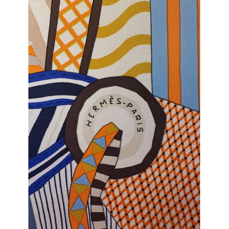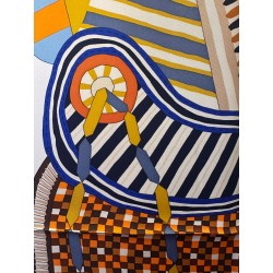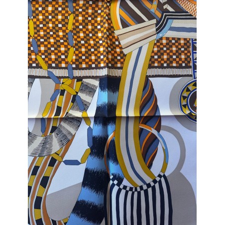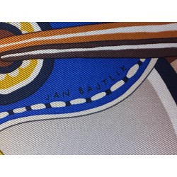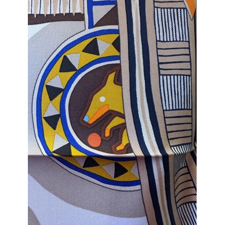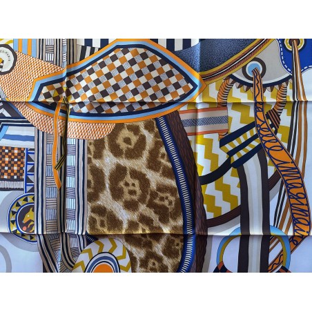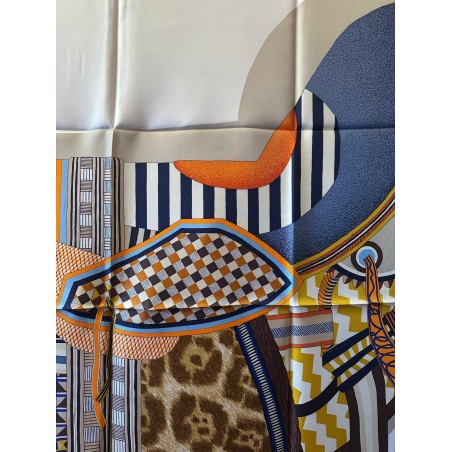 Émile Hermès (1871-1951), esthète éclairé et chineur infatigable, a rassemblé une multitude de curiosités soigneusement conservées dans les collections de la maison. Autant de trésors dont Jan Bajtlik s'est nourri pour imaginer et dessiner une nouvelle selle. Tressages, torsades et jeux de perspective l'habillent de lignes dynamiques. Les nombreux motifs évoquent des contrées lointaines et invitent au voyage. Comme à son habitude, le dessinateur a glissé le profil de son chien Kluska au coeur du dessin... Le trouverez-vous?