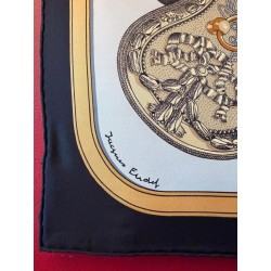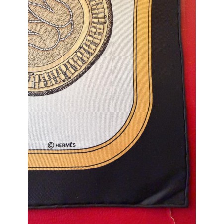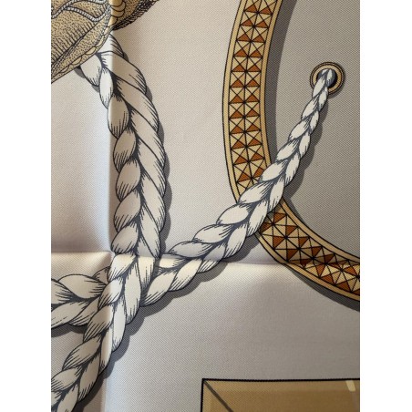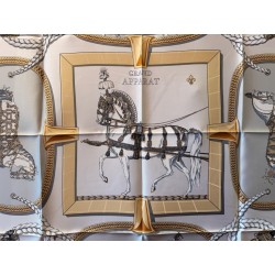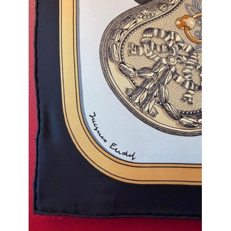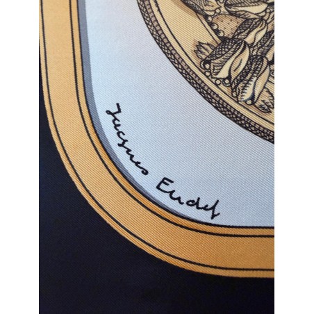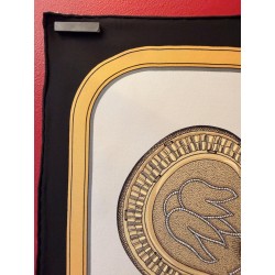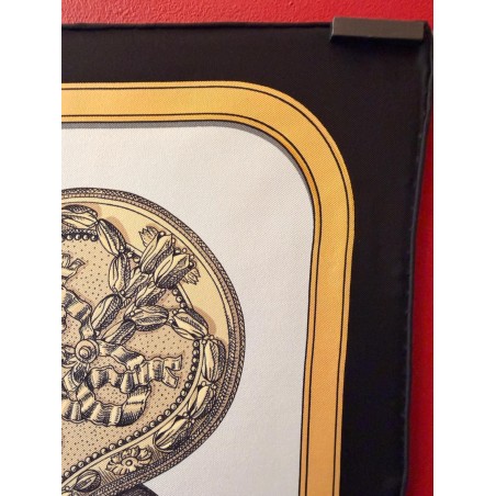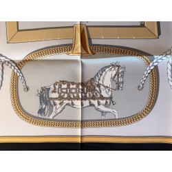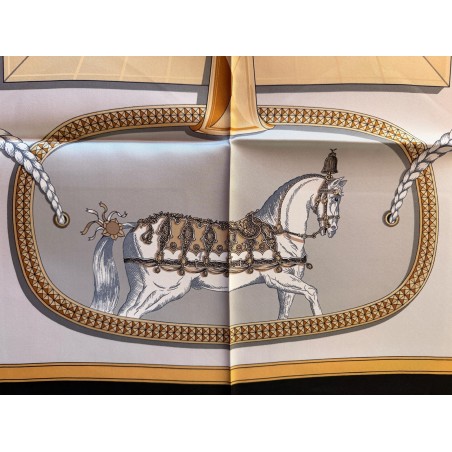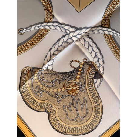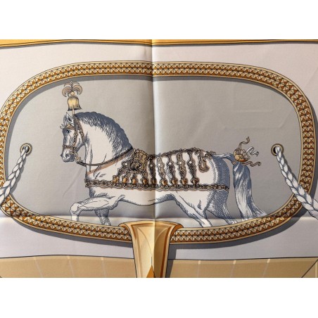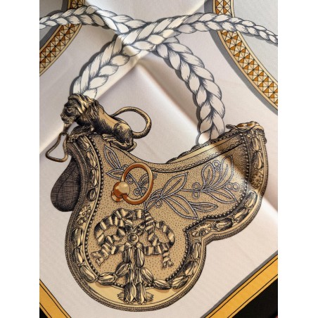 Ce carré met en scène différentes pièces de harnais de cérémonie et principalement des sellettes, ornements destinés aux parades et aux cérémonies. Le luxe de ces harnais de galas, en cuir repoussé, bordé de franges ou de galons, rehaussés d'éléments en bronze, feuilles de laurier, emblèmes royaux, armoiries, indique la noblesse du personnage transporté et l'importance de l'évènement. Retenu par des clous pyramidaux et des soutaches, le tableau du centre s'inspire du dessin d'un cheval harnaché destiné à un projet de voiture pour le sacre de Louis XVIII. Et les tresses rappellent celles des crinières, toujours impeccablement coiffées et parfois même nouées de rubans.