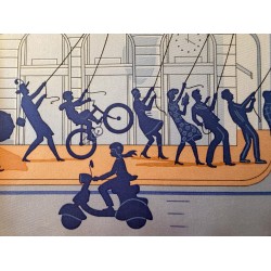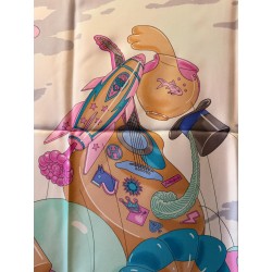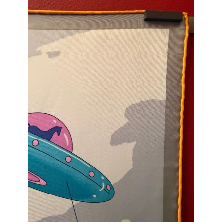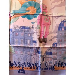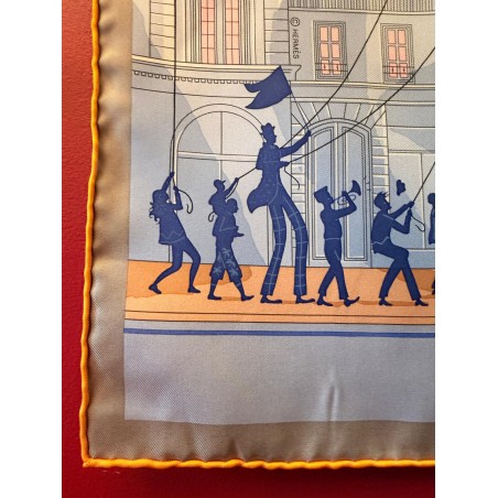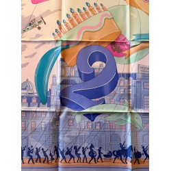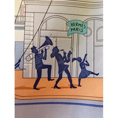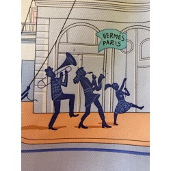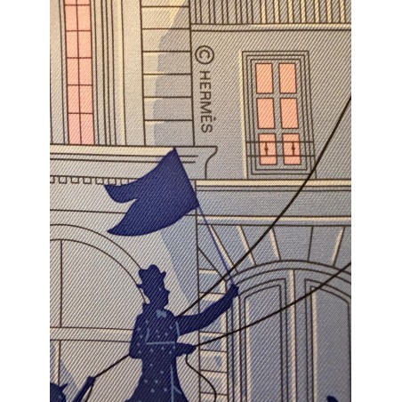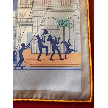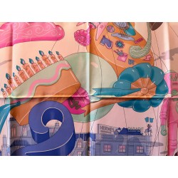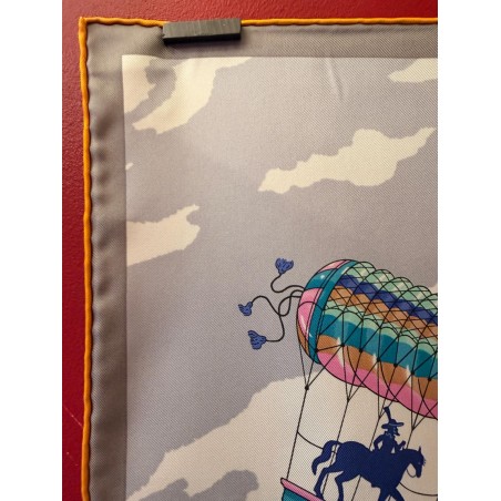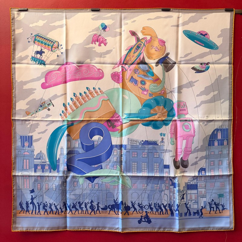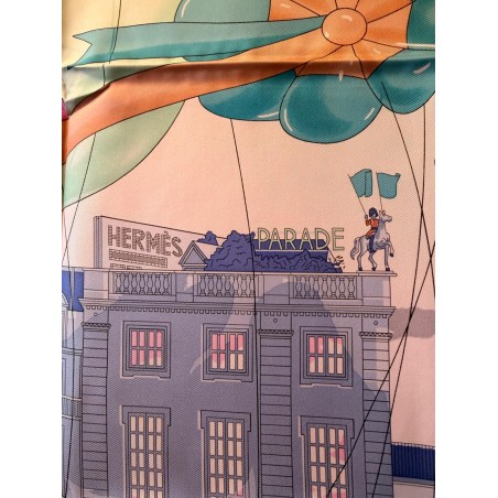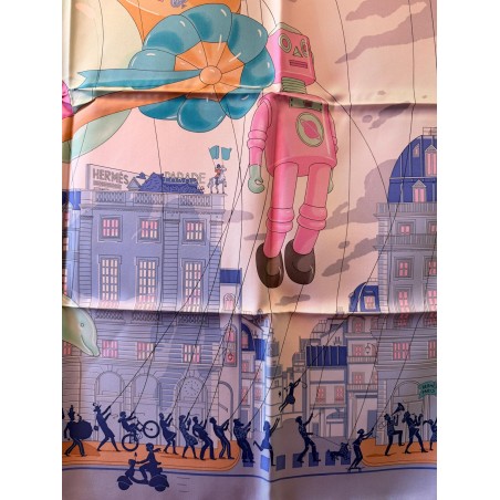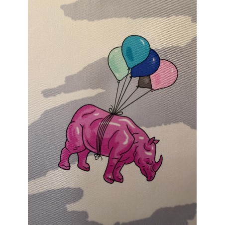 C'est la fête chez Hermès. Tout le monde s'est donné rendez-vous rue du Faubourg Saint-Honoré, paré de son plus beau ballon. Une drôle de galerie parade dans le ciel bleu et danse dans le vent. Un dauphin côtoie une banane, une boule de billard flotte en direction d'une fusée et magie de l'apesanteur, un rhinocéros s'est même envolé. Ne manque plus qu'un cheval... Mais d'ailleurs, n'en serait-ce pas un qui se dessine là-haut, nuage éphémère dans les airs ?