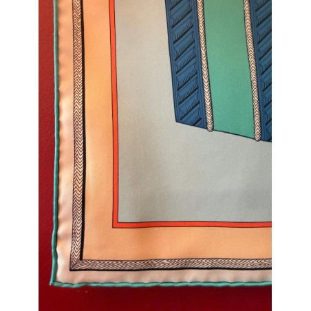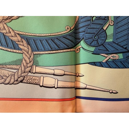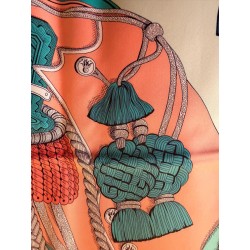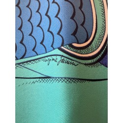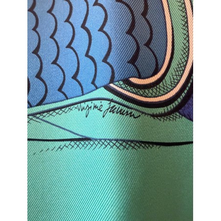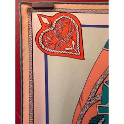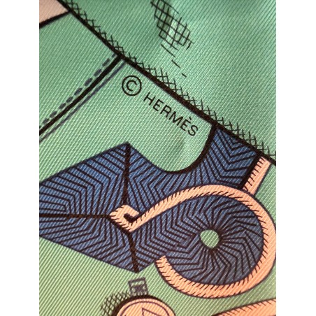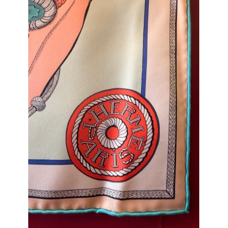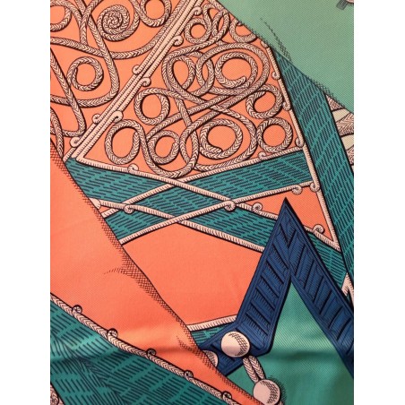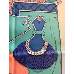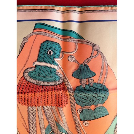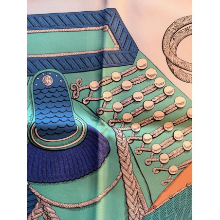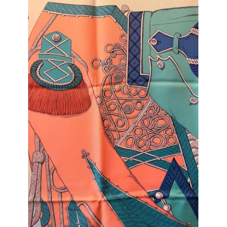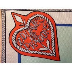 Tenues de zouaves (unités françaises d'infanterie légère d'Afrique) et de dragons (soldats de cavalerie servant à pied ou à cheval) donnent son titre à ce carré. L'inspiration du dessin est née d'un album de costumes militaires du 19 ème siècle, conservé dans la collection Émile Hermès. Semés de passementeries, papillonnant de galons, soutaches et broderies, les costumes semblent prendre vie en une majestueuse chorégraphie. Tournoiement de vestes et farandole de couleurs s'imbriquent et se déploient sur la soie comme des échanges secrets.