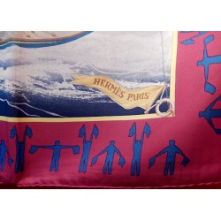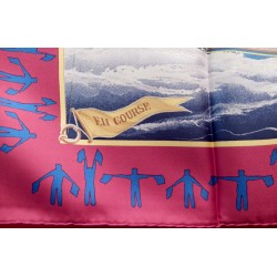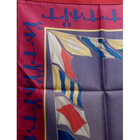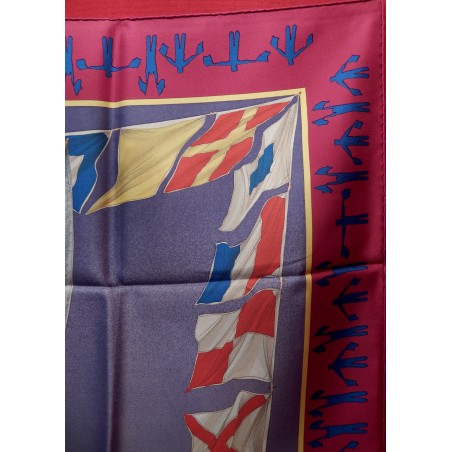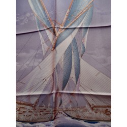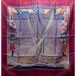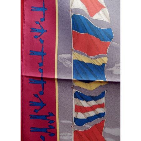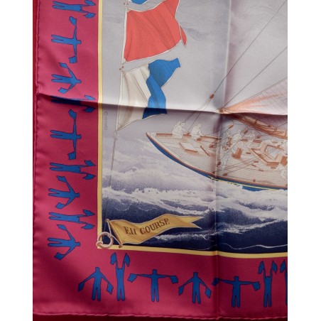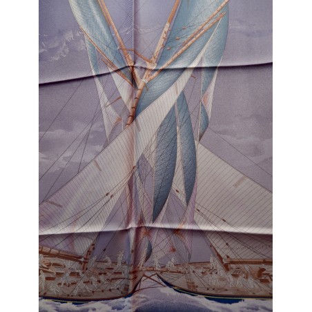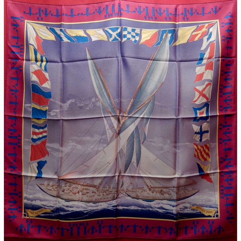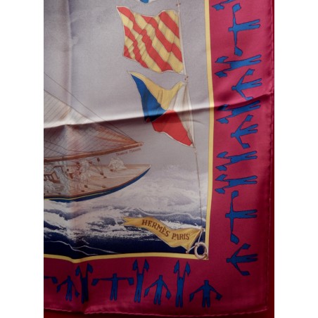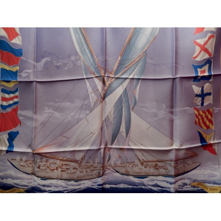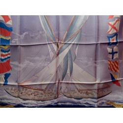 La lutte est sans merci dans cette "attaque au près". Le voilier que l'on voit "tribord amure" (qui reçoit le vent par tribord, à droite) a priorité sur son adversaire qui doit alors choisir entre virer de bord et passer derrière en "abattant", c'est-à-dire en changeant de cap pour écarter son avant de la direction du vent. Que les initiés s'y retrouvent ! Il suffira au profane d'admirer le bel encadrement que forment les pavillons représentant les 26 lettres de l'alphabet.