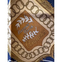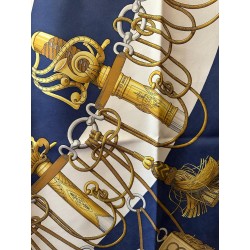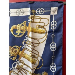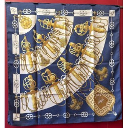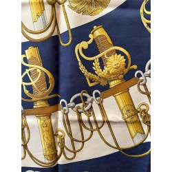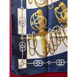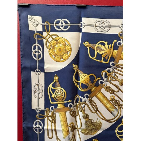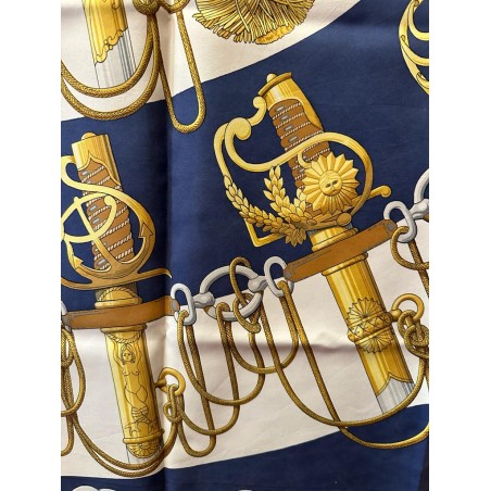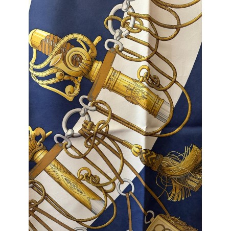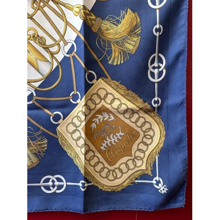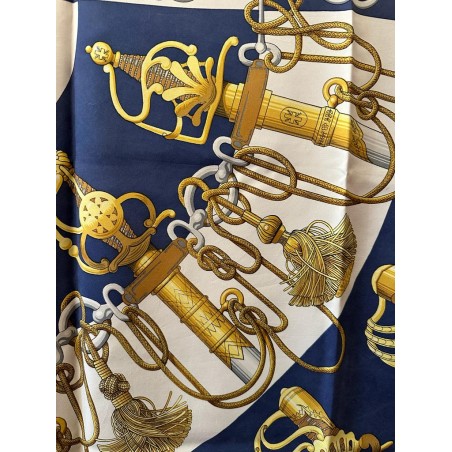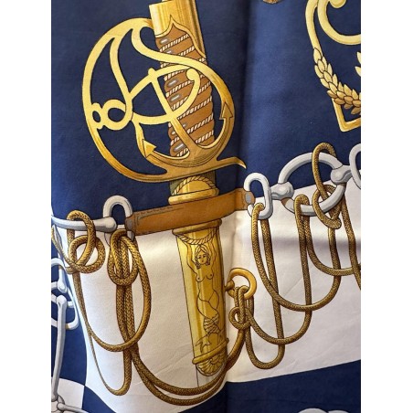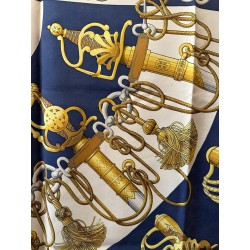 Dans une étonnante composition en éventail, le carré "Cliquetis" s'inspire d'un ensemble de dessins à la plume et à l'encre noire appartenant à la collection Emile Hermès pour présenter une série de sabres militaires. Dotés de poignées magnifiquement ciselées, décorées d'arabesques, de motifs végétaux, animaliers ou tout simplement géométriques, ces sabres étaient retenus au ceinturon par des mousquetons et ornés de longs cordons et de gros pompons de passementerie. En bas à droite une sabretache bordée de franges (sacoche plate à l'origine arborée par les régiments de hussards) complète la composition, cernée d'une chaîne constituée de mors de filet.