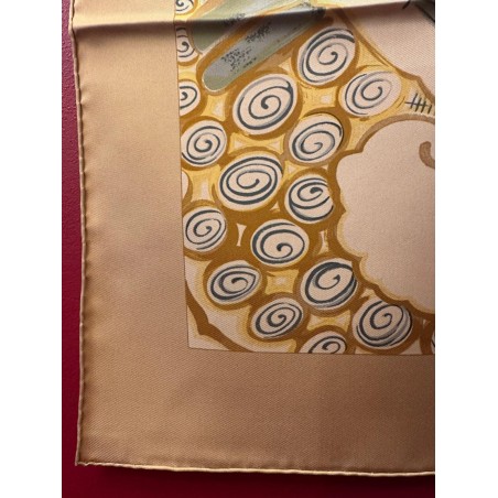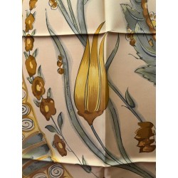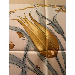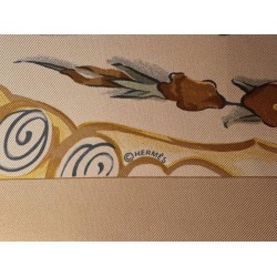 Dans l'Italie de la renaissance, les Médicis, collectionneurs et mécènes, admirent la marqueterie de pierres au point de lui dédier plusieurs ateliers. Certains artisans oeuvraient des années durant pour confectionner un plateau de table tel que celui qui inspira ce carré. L'engouement pour cet art voyagea en particulier vers l'Angleterre et vers la France. Un foisonnement de fleurs de fruits et de feuillage enserre dans ses courbes oiseaux bigarrés, papillons et insectes, colliers de perles et rubans. La finesse du trait anime plumes et pétales, les baies charnues sont une invitation... La vie, dans toute sa beauté fragile traverse cette composition minérale. La soie se substitue ici à ces pierres travaillées.